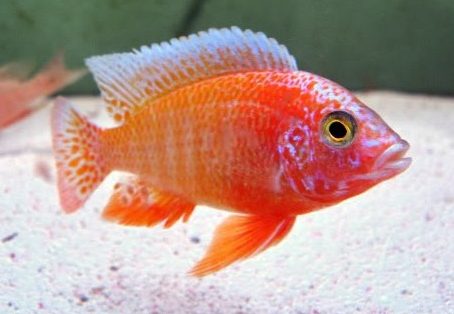 Аулонокара Ред рубин – еще один результат работы селекционеров. Длина тела – 12-15 см. Самки неяркие, имеют бежевый или оранжевый окрас. Самцы характеризуются ярко-красной окраской с заметными светлыми полосками и синей головой. Содержание не отличается от других аулонокар.