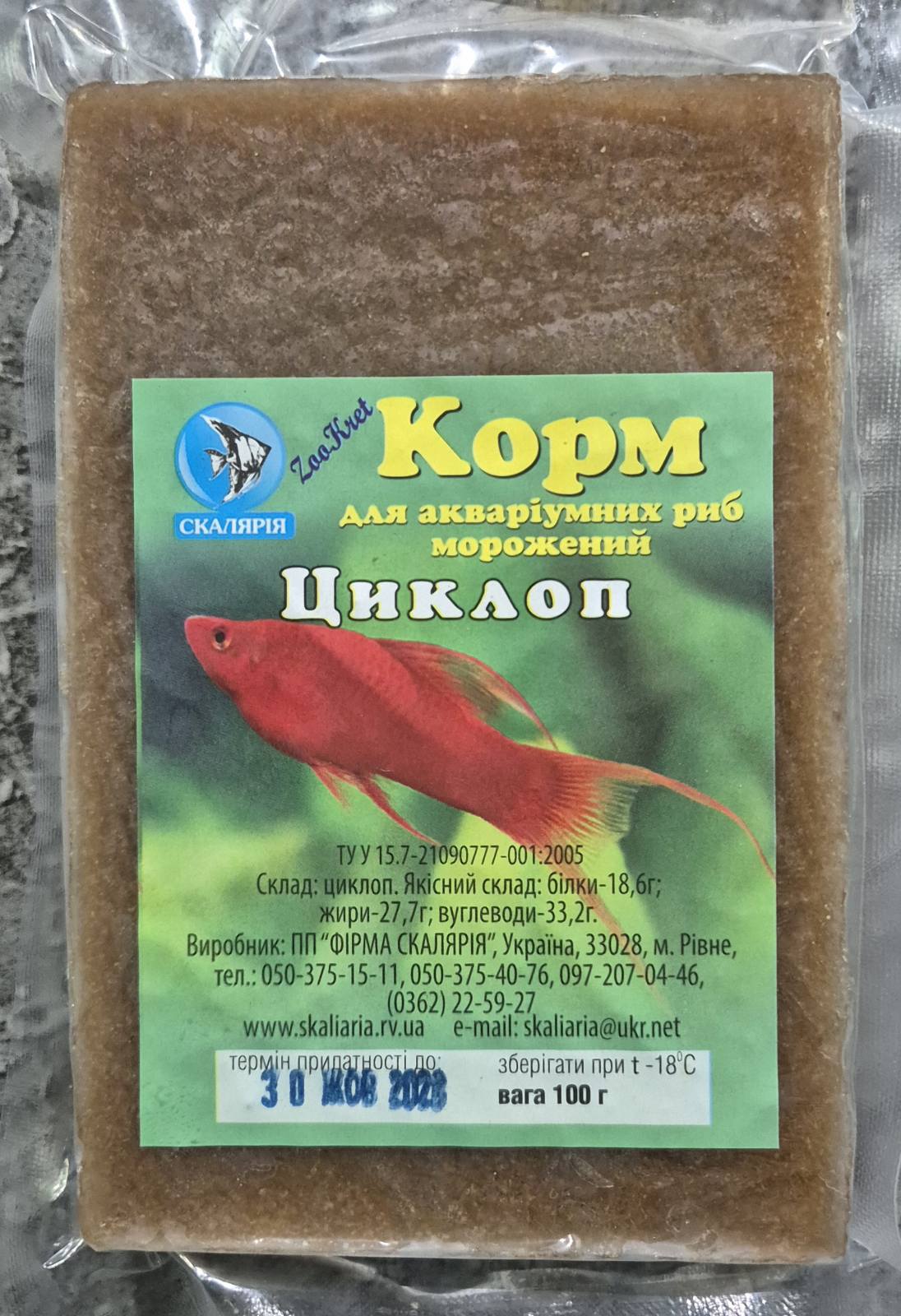 Циклоп – найкращий заморожений корм для більшості мальків та для посилення природного забарвлення дорослих риб. Колір циклопу залежить від місця та часу видобутку. Ефект від годування циклопом ви побачите вже за кілька днів. Заморожений Циклоп випускається нашим підприємством у трьох видах упакування. Для великих та середніх акваріумів у блістері.