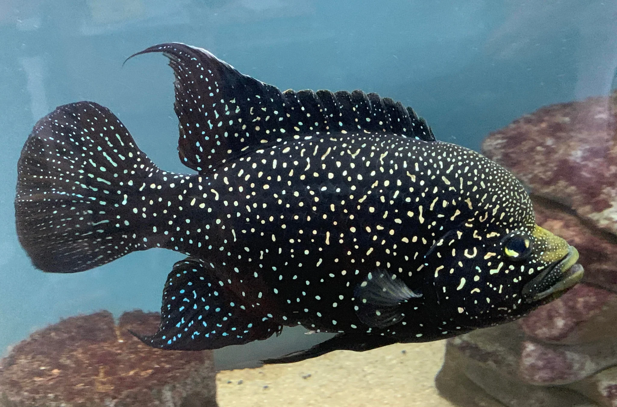 Основне забарвлення тіла чорне або буре з численними хаотично розташованими білими плямами. Достовірно відомо, що у природі зустрічаються особини, як із дрібними плямами, і з більшими. Деякі вчені припускають, що це різні види, але поки що суттєвих підтверджень цьому немає. Відрізнити самця можна за характерним жировим наростом, що утворюється на голові. А також за більшим розміром та подовженими плавцями.